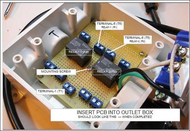 Encontrar la marca "T" que hizo en su caja. Tienen colocado lejos de usted. Inserte su PCB en la caja de salida. Letras alfa estará en el lado derecho. TERMINAL-1 (T1) estará en el lado izquierdo. Line el montaje del tornillo con el agujero perforado en el aumento de plásticos en el centro de la caja. Asegúrese de que el tubo corto se queda en el tornillo de montaje. Apriete el montaje hasta firmemente en su lugar y separadores están firmemente sentado en la parte inferior de la caja.