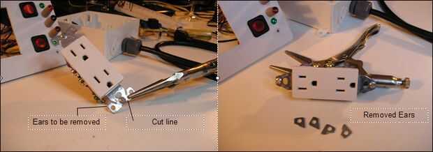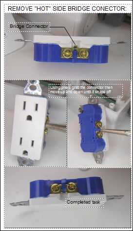 Mirando el lado caliente de la salida verán dos tornillos Unidos a las placas de color cobre. Las placas debajo de cada tornillo se conectan mediante un conector de puente. Alicates - tenga cuidado de tomar el centro del puente y mover arriba y abajo hasta que se despeguen. El puente es difícil de agarrar tan tenga cuidado aquí. Una vez que lo mueva hacia arriba y hacia abajo hasta que encaje. Este paso le permite controlar cada salida independientemente.