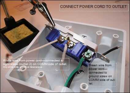 Insertar conectado salida en caja de salida con las ranuras COMM en el el lado izquierdo de la caja. Utilice el segundo conjunto de agujeros que se alinean con el soporte de los agujeros de montaje en la salida. Utilice los tornillos de montaje que viene con el enchufe e introducir en los agujeros de montaje de la caja. Atornille los tornillos de montaje de forma breve. Se necesita espacio en el futuro para agregar otros elementos para el proyecto y ser capaces de conectar los cables de la placa. Doble el cable tomacorriente-1 hasta la parte inferior de la salida y la ruta alrededor de la parte inferior y hacia fuera para abrir espacio en medio de la caja.