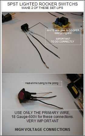 Estos interruptores se conectarán a alta tensión, por lo que es necesario utilizar las de calibre 18, alambre 600V para esta tarea. Es importante que conecte el cable blanco sólo en el cobre del diente en el interruptor. LA SEGURIDAD ES IMPORTANTE AQUÍ. Conecte el 5"- negro - cable primario, calibre 18, 600V - pelados 1/8" y 1/2" en extremos y estañado a la pata del centro. La conexión con el extremo del cable 1/2". Será la última conexión con el 5"- negro - primario de alambre calibre 18 y 600V - pelado 1/2" en cada extremo y estañado. No importa cual se conecta como ambos son 1/2" de largo. Una vez que todas las conexiones son soldiered, añadir la tubería del encogimiento del calor para la conexión a la base del interruptor.
