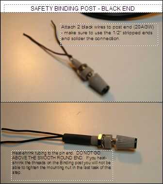 Se trata de la conexión a tierra para el Arduino. 2 negro (20AWG) cables de rayas 1/8" y 1/2" en los extremos. Usando 1/2" extremos conectan el perno de metal frente a la parte superior"Negro". Soldar los cables a la clavija. Una vez seguro, añadir la tubería del encogimiento del calor hasta el final del pin. NO VAN POR ENCIMA DEL EXTREMO REDONDO LISO. Si calor-encoja los hilos en el post de Unión no será capaz apretar la tuerca de montaje en la última tarea de esta etapa.