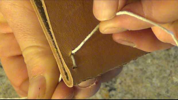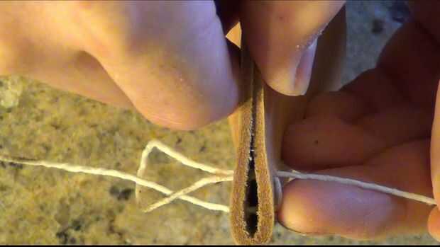 El hilo de cera terminado abierto necesita ser alimentado por el lazo creado por tirando del hilo a través de. Una vez a través de la banda de rodadura, tire de ambos extremos de la cuerda hasta que el "nudo" es colocado dentro de las dos piezas de material.