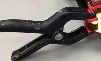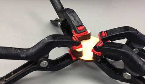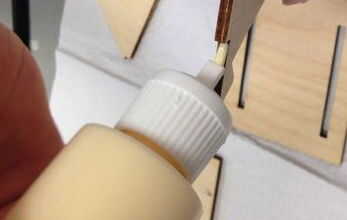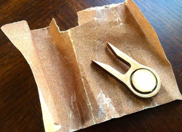 Una vez que se recortan las piezas, tienen que ser pegadas. Conseguir algún pegamento de madera y extenderlo en tus prendas con un clip o un palillo de dientes. Firmemente junte todas las capas y las capas de la abrazadera hacia abajo cuando haya terminado. Después de cortar las piezas puede haber algunas marcas humo izquierda. Para crear un acabado liso, usé papel de lija para suavizar la madera y quitar marcas de quemaduras. Una capa transparente de acabado también ayudará con la durabilidad. Después de una hora, retire las abrazaderas y disfrutar de su nueva herramienta de reparación divot de golf.