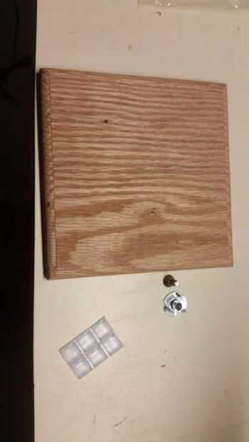 pieza de 6 x 6 x 1/2 pulgadas de roble rojo (alrededor de $4) previamente había comprado un tablero para cerca de $12 y mucha sobra para otros proyectos. Una tienda de hobby puede vender lámparas o Mostrar bases que también funcionan, sólo ajustar la longitud del tornillo si su base es más gruesa.