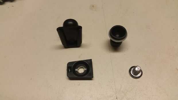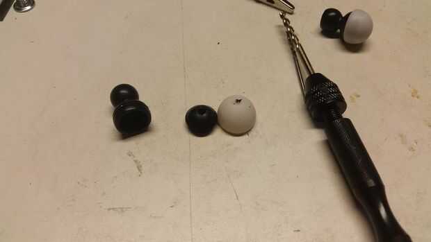 Uso un conjunto de pinzas ajustables para sujetar los pies de bola ser cuidado de no dañar la superficie de montaje mientras trabajas. Cubrí mis mandíbulas de pinzas con un encogimiento del calor para proteger el plástico y dar mayor agarre. Utilice un tornillo de perno para perforar cuidadosamente un agujero piloto a través del tapón de goma y bolas de plástico subyacente. entonces de nuevo el tapón de goma y utilizar un taladro con una broca de 3/16 Avos para agrandar el agujero. En este punto la tapa de plástico provenientes de suelta la bola, que honestamente hace más fácil. Repita para el segundo pie. Cuadro 4 muestra el pie tirado aparte perforados y listos para volver a armar.