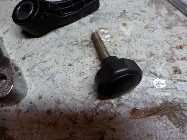 Taladré un agujero apropiado en el brazo de biela para aceptar esta perilla. Al perforar a través del metal duro, asegúrese de utilizar una broca afilada, un montón de lubricación y tomar lento. También, utilice un tornillo de banco u otra cosa fuerte explotación. Sosteniendo con la mano es una receta para el desastre. El taladro en realidad arrancó de mi mordaza y lanzó el brazo de la biela a través del cuarto. Me dio un buen susto...