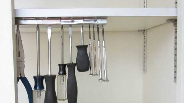 Aquí está una manera rápida y fácil para ordenar todas tus herramientas pequeñas en estantes más convenientes. Es probable que usted ya tiene todo lo que necesitas para hacerlo - por lo que es muy barato.La mayoría de herramientas son ferrosa (es dec