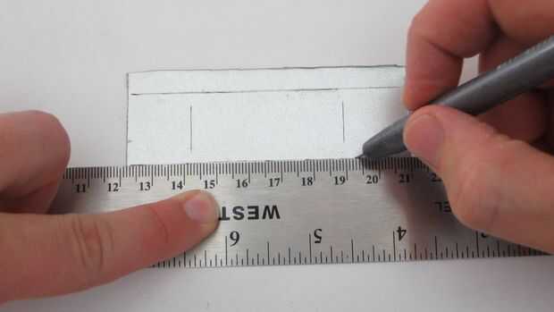 Coloque el imán hacia abajo en el centro de la pieza cortada de la chapa. Luego con un lápiz o un marcador con punta fino, traza el contorno del imán. Cuando se quita el imán, debería ver un contorno claro. Con el lápiz (o marcador) y una regla las líneas de cada lado del contorno para que vayan por todo el metal de hoja. Esto hará que una cuadrícula de nueve rectángulos en la superficie.