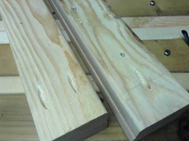 Cuando construyo proyectos tienda normalmente utilizo lo he conseguido ahí. Si consideras este ser económicamente ingeniosos o ecológicamente responsable, es principalmente porque soy barato y no importa cómo se ve. No va en la sala de estar después de todo. Tuve cortes de cedro de 4 x 4 y algunos 2 x 4 y 2 x 6, eso es lo que usé. La parte superior e inferior son 38" de largo y las piernas son 24" de largo. Puede que necesite ajustar la longitud de las piernas dependiendo de cómo altura desea la parte superior y las ruedas de tamaño empleadas. Las piernas son simplemente dos 2 x 4 atornillado con tornillos de agujero de bolsillo 3 en cada extremo. Toenailing 2 tornillos de un lado y 1 tornillo de las otras marcas para una articulación más fuerte. Utilice los tornillos de bolsillo largo 2 1/2" para unir las piezas. En primer lugar, sin embargo, usted necesitará taladrar los agujeros para el eje antes del montaje de los separadores.