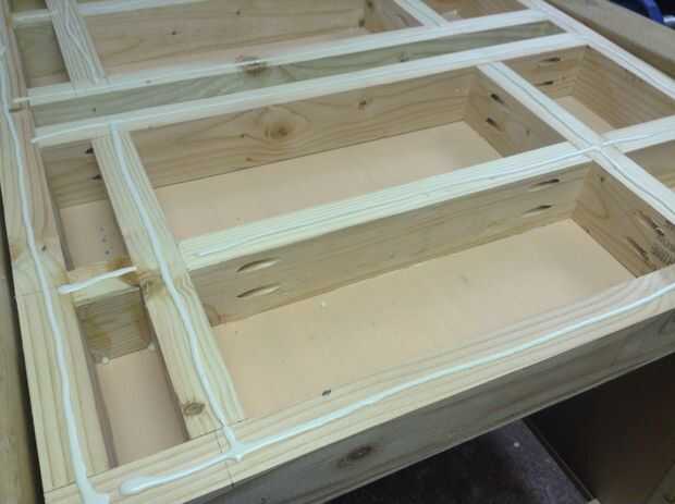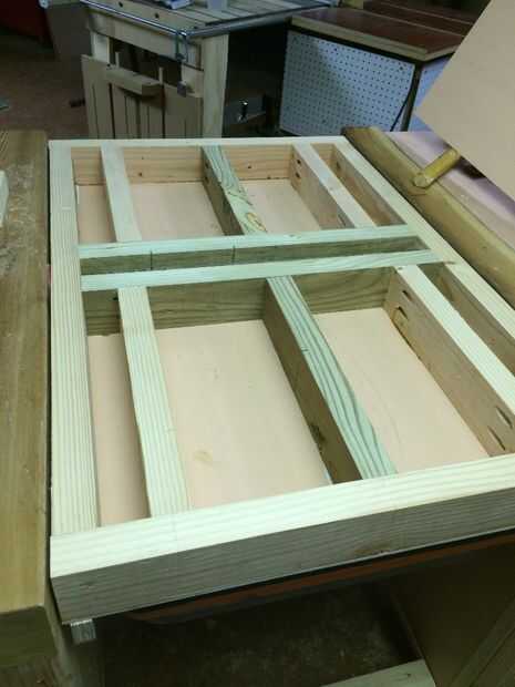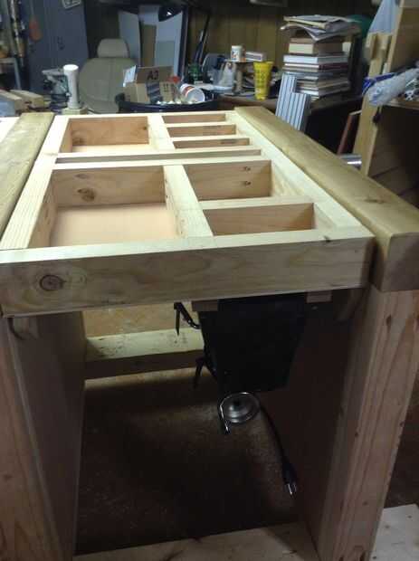 Esta parte toma un poco de calcular ya que cada superior debe enmarcarse para una herramienta de montaje en ambos lados. La posición de la estructura interna se determinará por la ubicación de los orificios de montaje de sus herramientas. Plan para cada pieza 1.5" Creo que al estar centrado en uno de los orificios de montaje de la herramienta. De esta manera, los tirafondos o tornillos utilizados para sujetar la herramienta entrará en el marco en el centro. Es una buena idea tomar fotos para futuras referencias. Asegure el 3" piezas de estructura amplia con 2 1/2" tornillos de agujero de bolsillo.