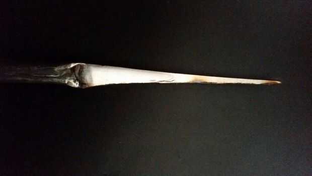 A continuación, puse mis gafas de seguridad y sujeta el cuchillo contra el borde de un banco de trabajo. Al molinillo lateral (con disco), seguí mi línea de guía. Muy pronto, había cortado la hoja en la forma que quería. El proceso fue muy fácil con la amoladora, pero estoy seguro de que sería posible con una herramienta Dremel o aparato similar. Sería muy divertido, pero incluso podría hacerlo con una sierra para metales o bruto bastardo, dado suficiente tiempo.