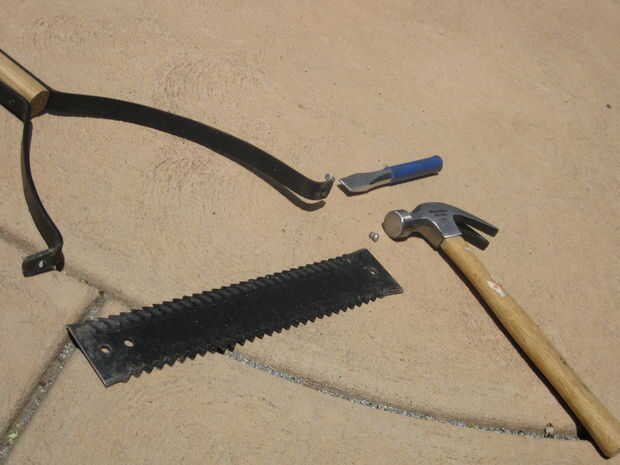 Lo primero que tuve que hacer fue desprender los remaches de la pala a su montura. Generalmente uno sería participar en una operación de ese tipo con una sierra para metales o una dremel, incluso una amoladora. Sin embargo encontré una astilladora y un martillo suficiente como en este caso sólo parecía ser de aluminio. Unos buenos golpes y estaba libre.
