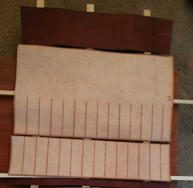 Luego utilicé un cortador láser para cortar los agujeros y luego la forma general de la herramienta rollo piezas. Cortando los agujeros primero el cuero no se movería.