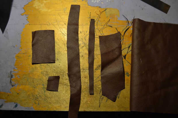Después de me corte la piel en forma rectangular y cortar unos pedazos de cuero que sostenga las herramientas en su lugar.