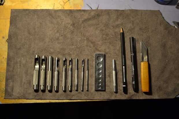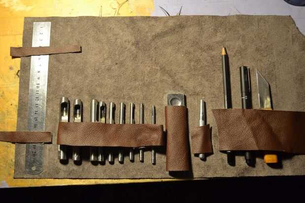 En primer lugar, he encontrado un gran pedazo de cuero y decidido en qué posición voy a colocar las herramientas en el rollo.