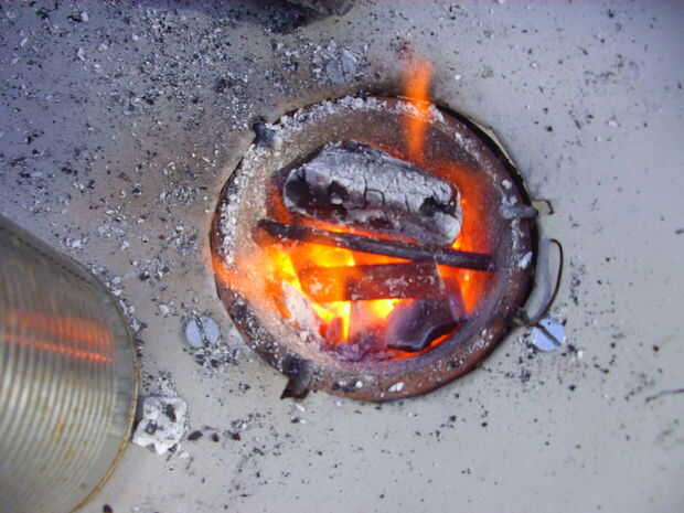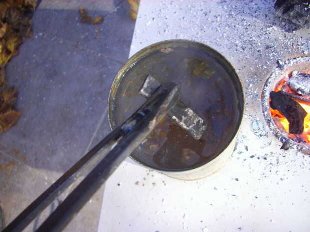 Una vez enderezadas aceptablemente las piezas, les hice un choque térmico para devolverles la dureza: las volví a calentar al rojo y las sumergí rápidamente en agua a temperatura ambiente.