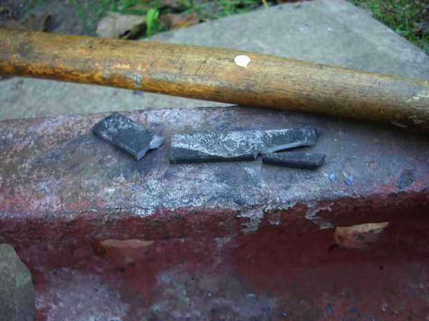 Acá empieza la parte delicada: me excedí en el choque y quedaron sumamente duras (la lima no les entra) pero también muy quebradizas. Month ver cuál es el punto de dureza más me cualquiér, porque no siendo el filo muy agudo, es probable que sirvan así como están. Si veo al usarlas no duran lo esperado, trataré de ir ablandándolas de un poco mediante calentamiento y enfriamiento lento hasta obtener una dureza personal.