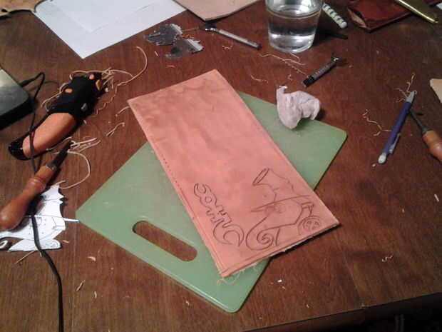 puse el dibujo de la piel y utiliza un lápiz (firmemente presionado) para transferir la imagen. una vez que lo tenía en, usé un cuchillo giratorio para cortar la imagen in el truco para usar un cuchillo del eslabón giratorio es no cortar completamente a través. se necesita solamente 1/4 a través de la piel.