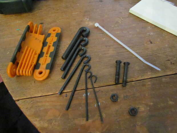 3) Mantenga las tuercas hexagonales, el perno más largo de las dos y ambas tuercas. Bin el resto.