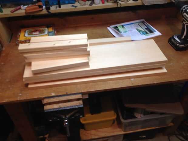 Todo está hecho de una sección de 4 pies de pino de 12 pulgadas y una sección de 8 pies de pino de 8 pulgadas.  Utilizando una sierra de mesa cortar las piezas individuales usando la programación en el artículo original (véase el primer paso para la referencia).