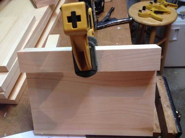 Los extremos con una tira de madera en la parte superior que se convertirán en los puños cuando desea transportar la caja de herramientas.  Use pegamento y avellane los tornillos con una broca de avellanar.  Utilicé tornillos de 1 pulgada para este paso.