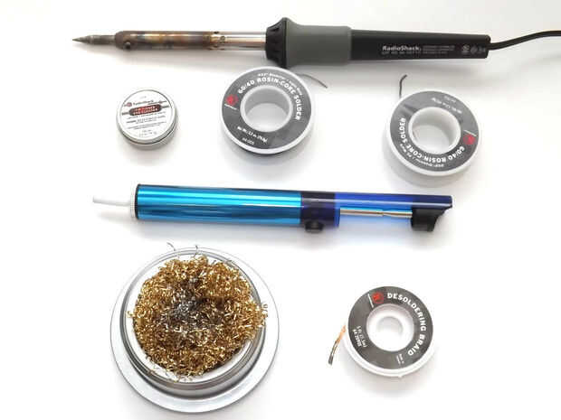 + mecha de soldadura y vacío - para desoldar piezas cuando arruinara. Utilizar la aspiradora para grandes cantidades tanto la mecha (también conocida como trenza de desoldar) para pequeñas cantidades. Usted también puede obtener un all-in-one desoldador con una bombilla de vacío conectada. Personalmente no me gusta. Creo que es demasiado difícil de manejar la bombilla y el hierro en la misma mano, pero I'bler bergerab ama su.