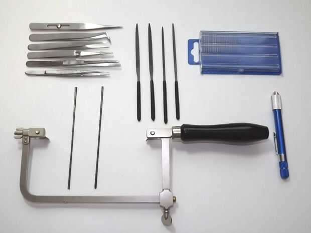+ Cuchillas y Sierra de joyero - se parece a una sierra de marquetería pero es de muy buen trabajo con el metal. Bueno para precisión cortes en espacios pequeños. Para cortes más grandes utilizar una sierra para metales ya que los finos dientes de cortes muy limpios. Una maquinilla de afeitar de X acto vio funcionaría bien.
