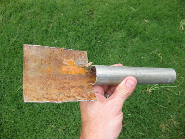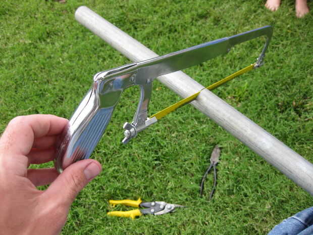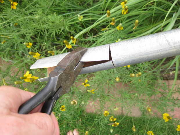 Corte sobre una sección de 12 pulgadas de tubo con una sierra para metales. Cortar 1/3 de la bajada de la tubería; cortar casi todo lo largo, dejando algunos metal para mantener las piezas Unidas. Luego corte longitudinalmente con la Sierra del extremo para el corte, haciendo una apertura de la "T". Doble el pedazo entero abierto, teniendo cuidado de no tensionar demasiado la pieza de conexión.
