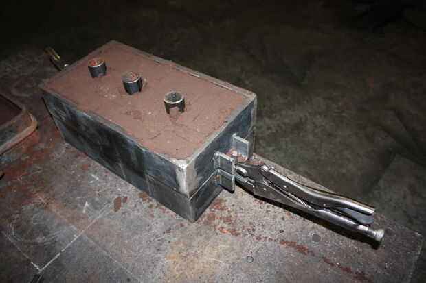 Imagen 2: Aquí están tres pour canalones (o cavidades) que hemos creado en la arena. La cavidad en la arena se forma mediante el uso de un patrón (una copia aproximada de la parte real, o, en este caso, tres pipas que son ligeramente más grandes que los cinceles). La cavidad está contenida en un conjunto ubicado en una caja llamada el frasco. Base es una forma de arena en el molde para producir las características internas de la parte tales como agujeros o pasajes internos. Núcleos se colocan en la cavidad para los agujeros de la forma de las formas deseadas. Base de impresión es la región añadida al patrón, base o molde que se utiliza para localizar y apoyar la base en el molde. Una canalización vertical es un extra vacío creado en el molde para contener excesivo material fundido. La finalidad de este es alimentar el metal fundido a la cavidad del molde el metal fundido se solidifica y se contrae, y así evita espacios vacíos en el bastidor principal.