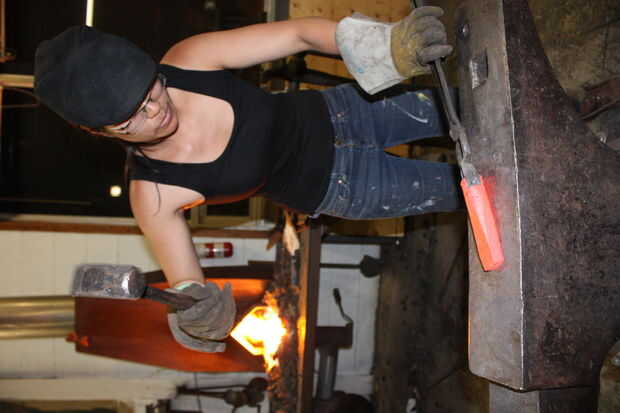 IMAGEN 4: La formación final de los cinceles es todo hecha a mano. Aquí Tina forma la forma del cincel por el dibujo hacia fuera y disminuyendo al final.