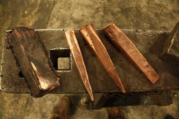 Cobre puede haber sido el primer metal para ser trabajado en Egipto, incluso antes el oro metálico. Los minerales tuvieron un contenido de 12% de cobre y dada la escasez de combustible y las dificultades de transporte bien uno puede maravillarse con el hecho de que tuvieron éxito en la extracción de cobre en todo. En un principio fue probablemente trabajó frío. En los ornamentos de cobre egipcio tumbas tempranas, han encontrado vasos y armas así como agujas, sierras, tijeras, pinzas, hachas, azuelas, puntas de arpón y la flecha y cuchillos.