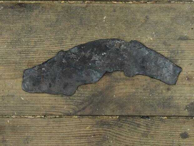 Eventualmente terminó mirando como este. Este cuchillo debe ser curvado. Se puede ver cómo una curva básica ha sido martillada en el metal durante la forja.