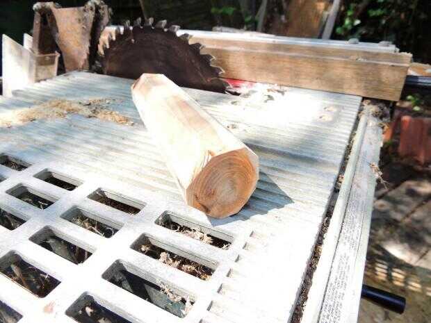 El mismo registro con todos los cantos y corteza eliminado cuadrados longitudinalmente. La madera necesitada es la preciosa madera de corazón rojizo. Esta es la parte más difícil y la mejor para hacer el mango. Todavía debe guardarse en un lugar fresco y seco durante mucho tiempo. 6 meses a un año sería mejor.