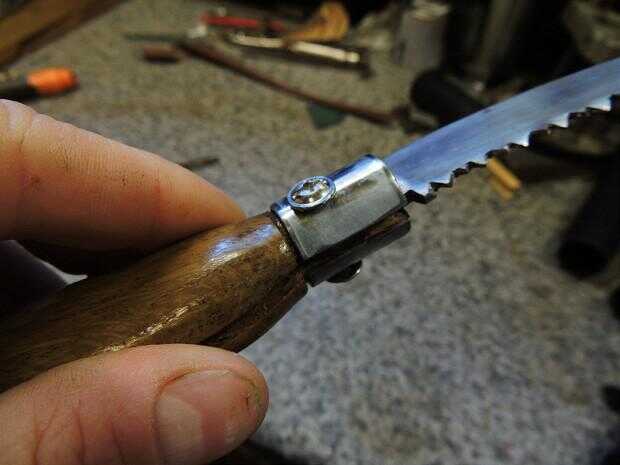 Aquí está la sierra acabada con virola y hoja de bisagra fija en su lugar
