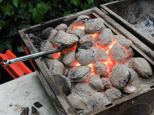 La tubería se encuentra en la barbacoa y está cubierta con ladrillos para ayudar a difundir hacia fuera el flujo a través de los carbones que se sientan encima de él. Es mejor que amontonar a carbón en la parte superior del tubo.