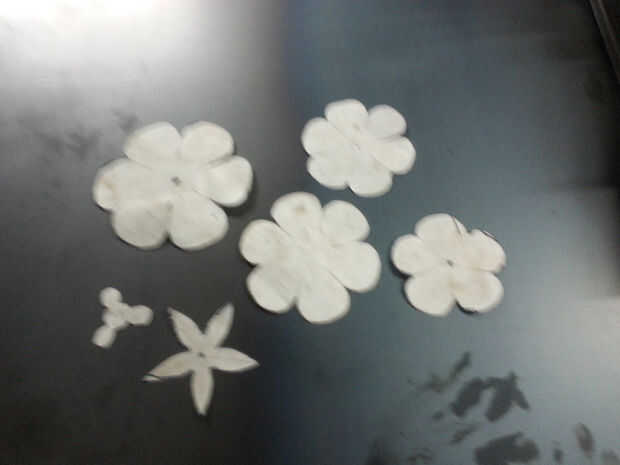 Lo primero, he hecho la plantilla en papel para tener una idea de cómo quería mi secciones de pétalo. La capa primera y más pequeña (o lo que será el capullo de rosa) es 3" de diámetro con 3 pétalos. la segunda capa es un 4" de diámetro dividido en 5 pétalos iguales. la tercera capa es un 5" diámetro con 6 secciones iguales. la cuarta y quinta capa son 6" diámetro con 6 secciones iguales. a continuación, la capa de la hoja final es 4" dividido en 5 hojas iguales. Y por último existe la opción de hacer pequeñas hojas a lo largo del tallo (se verá en el final pero son el mismo proceso que el resto) esto fue hecho con un compás y un transportador.