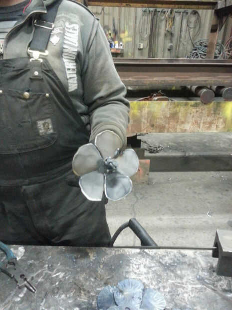 también se puede ver en la foto cómo los pétalos se unirá a la barra (madre). con un agujero en cada pieza, una vez que la rosa de 3 pétalos es soldada en el extremo, cada pieza se deslice hacia abajo el tallo y luego se viró, aumento de tamaño en cada paso.