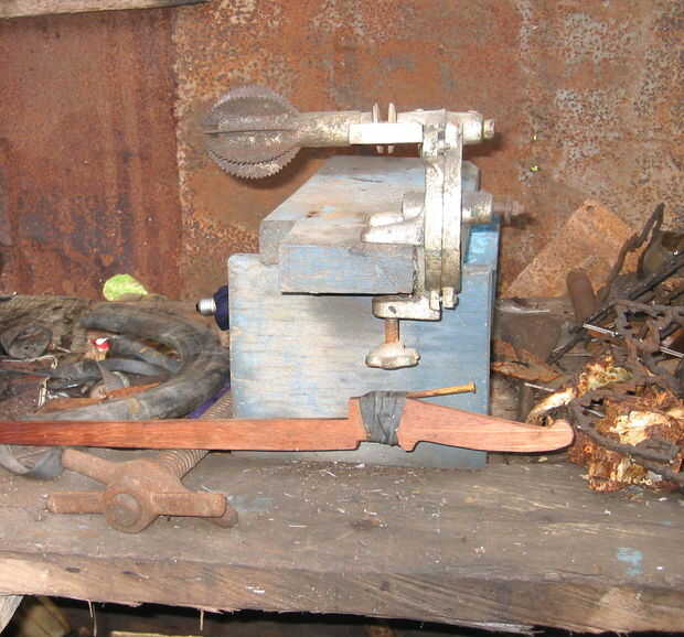 Lo de madera ornamentada en primer plano es un fusil con un mecanismo de disparo de un clavo.