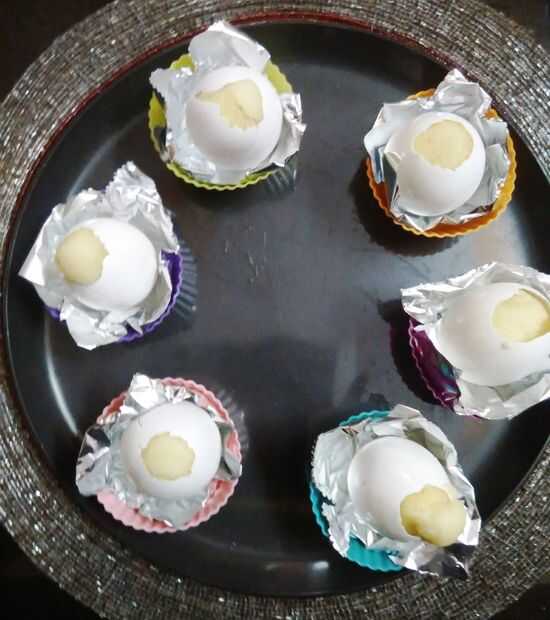 7. una vez que todos los huevos llenas, ponerlos en el microondas climatizado previo durante 3 minutos.