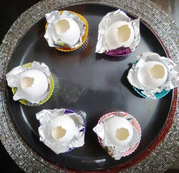 1. Coloque papel de aluminio en molde de cupcake como tal. Esto es para mantener los huevos estable y en posición vertical.
