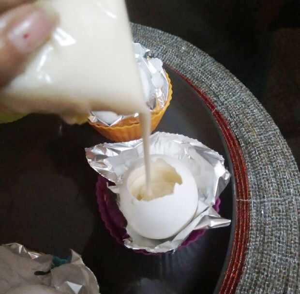 4. rellenar los huevos aproximadamente 1/4 completo con la masa.