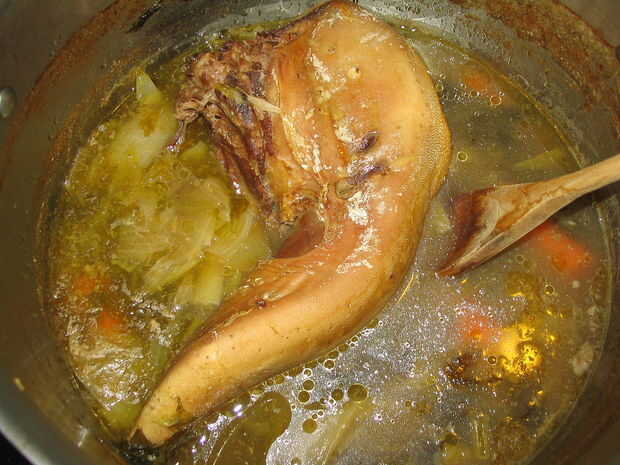 Mina dejó ir por mas de 3.5 horas, reponiendo el agua como necesario y periódicamente los bancos la lengua, luego apagar la olla e ignorarlo hasta que estaba listo para afrontar una hora o tan más adelante. La lengua ha vuelto terriblemente blanca al hervir (como cualquier piel cuando está encharcada, supongo) entonces las brocas expuestas fueron marrón como se sentó de enfriamiento y secado. Parecía un poco demasiado como una sección anatómica, que no era alentador.