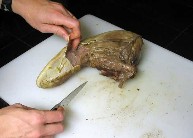 La piel salió muy cuidadosamente; Sólo tuve que usar un cuchillo persuadir a algunos pedacitos finos debajo de salir no se despegan mucho. Hay algunos bits auxiliares (vessles de la sangre, grasosas puntas glandulares, etc.) a los lados inferiores de la base de la lengua que se puede quitar fácilmente en este punto; se sentirá diferente, blandita y decididamente no carnoso y por lo tanto se puede separar fácilmente de las piezas buenas.