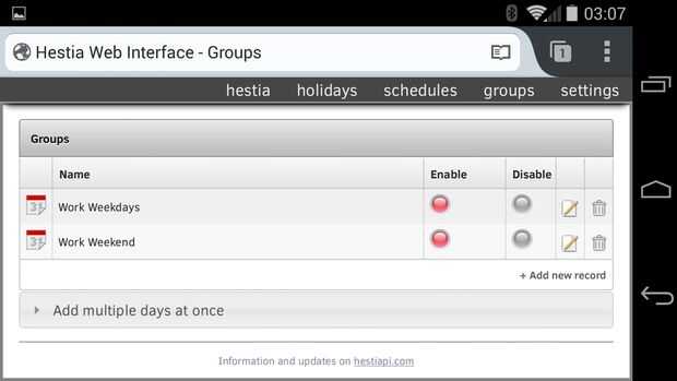 HestiaPi también soporta grupos de listas que puede grupo horarios individuales y habilitarlos o deshabilitarlos todos a la vez. Esto puede ser muy útil para personas con trabajos de cambio para que tengan un grupo para trabajar por la mañana y otro grupo para las noches. De esa manera puede permitir lo que quieran con uno haga click!