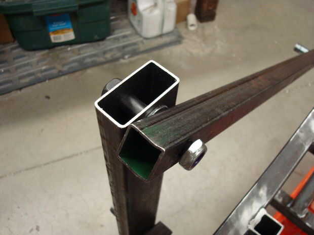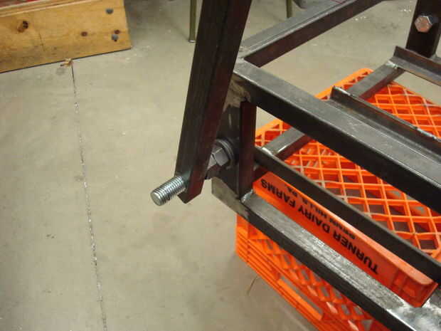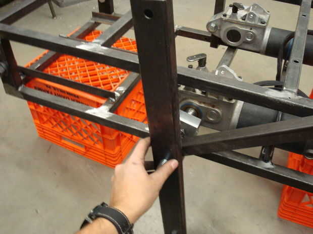 Localizar otro pierna y acoplamiento. Agregue la pierna al perno de la impulsión sobre el primer acoplamiento, con el madera pie apuntando hacia el suelo. Añadir el primer acoplamiento para el eje delantero, entonces Únete a la vinculación a la pierna de la misma manera es paso 12. No apriete los pernos de cualquier.