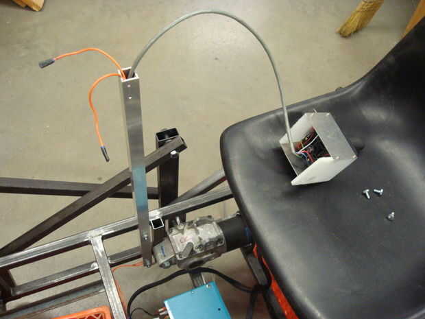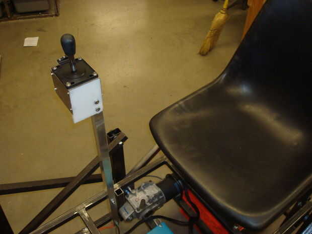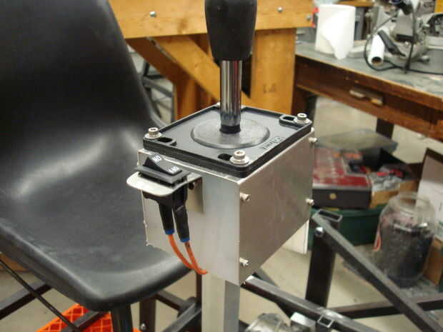 Montado mi joystick en una pequeña caja de metal de hoja y algunas láminas de plástico. El interruptor de parada de emergencia también se monta en este cuadro. Para colocar el joystick en una altura cómoda para el operador sentado, utilicé un trozo de tubo de aluminio cuadrado. El tubo se fija con pernos a la estructura, y los cables de la palanca de mando y parada de emergencia es alimentado por el interior del tubo. La caja de la palanca de mando se monta en la parte superior del tubo de aluminio con unos pernos.