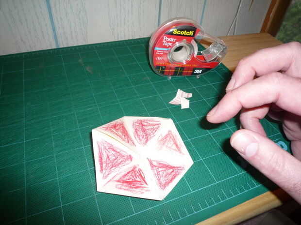 Haciendo las matemáticas, si queremos hacer una hexaflexagon de seis lados, necesitamos triángulos de 6 caras x 6 + pegamento 2 = 38 triángulos... que, dividido por dos, es una tira de diecinueve triángulos.