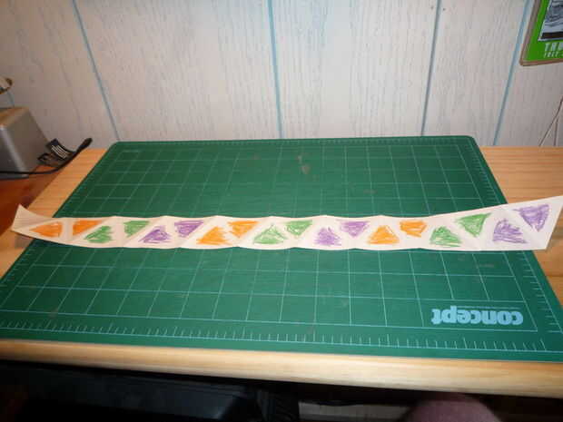 Tratando en este lado, trabajando de izquierda a derecha, unir los dos paneles naranja juntos, entonces los dos paneles verdes juntos, entonces los dos paneles de color púrpura, luego los siguientes dos paneles naranja juntos, y así sucesivamente. Este paso es "rodar para arriba."