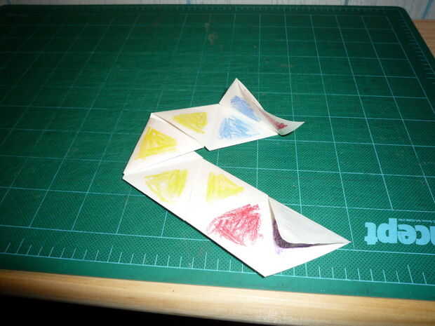 Ahora estamos dos pliegues a lo largo. Al final de la franja más cercana a usted en esta foto, con ese panel de pegamento que no quedarse colapsado - estaba en el lado derecho de la foto anterior. Los dos triángulos azules en la parte posterior deben reunirse entre sí ahora también.