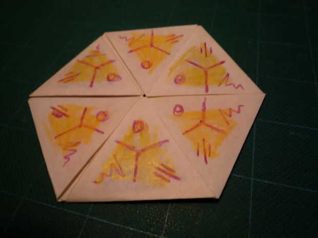 Lo que he hecho aquí, porque me daba pereza hacer una segunda hexahexa, es he dividido cada triángulo amarillo en tercios y ponga una marca distintiva en cada uno de ellos. Observe que los círculos están en el centro.